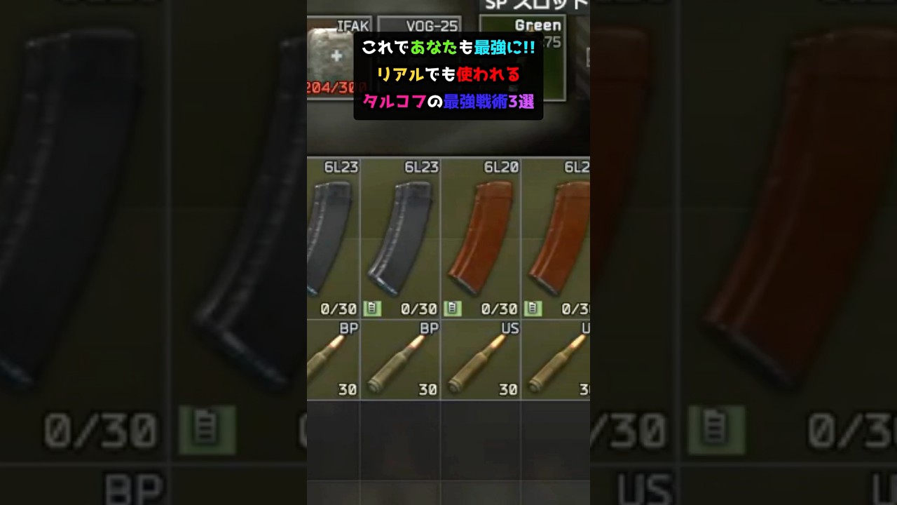 これであなたも最強にリアルでも使われる タルコフの最強戦術参戦。その1コ弾。 うっと光って場所することからあまり 好かれない弾ですがマガジンの最後の10 発をAコ弾にするといちいち残せずとも リロードするタイミングが分かります。 マジでめちゃくちゃ強いからやってみて。 そんなにチームで同じ系統の武器にするM 4とMDRみたいなのとかAKの 5.45mm系統とか同じ玉でなおかつ 同じマガジンを使用する武器を一緒に プレイするフレンドと合わせると誰かが先 にやられてしまってもマガジンを回収する だけで誰でもリロードできるので弾がつき ません。味方の分まで強く生きるんだ。 その3マガジンの色を変える。こっちの マガジンにはスカブ用のあまり強くない玉 。こっちのマガジンにはPMC用の めちゃくちゃ強い玉。このようにマガジン の色で玉を使い分けると今期は特に重要な 最強の玉たちが節約できるのです。慣れる とめちゃくちゃ強いかも。どうです?気分 だけでも特殊部隊みたいじゃない?是非 全部やってみてね。జ