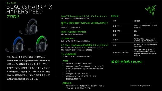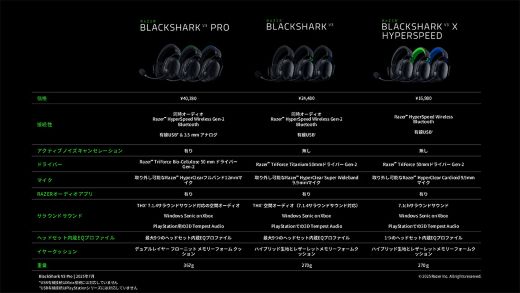 店頭価格はBlackShark V3 Proが40,780円、BlackShark V3が24,480円、BlackShark V3 X HyperSpeedが16,980円。カラーは通常カラーのBlack、White Edition(V3 Proのみ)、Xbox公式ライセンス取得でグリーンカラーのアクセントが施された「for Xbox」の3色。