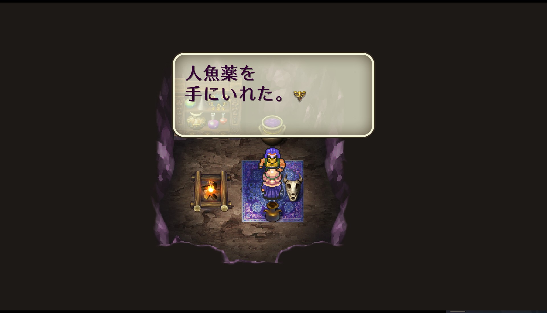 今度こそ、「トバ」で知らない間に取っていた「海ツバメの巣」、そして卵のから、アクア湖の水、必要なお金もそろえて魔女のほこらに行くと、人魚薬を作ってもらえました!