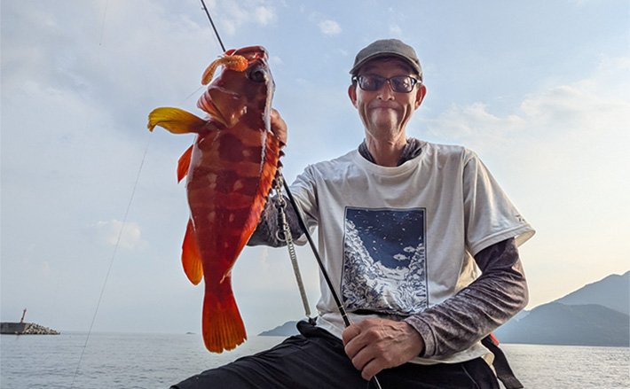 エギングタックルに、一誠の「根魚玉5g」とリグデザインの「ワウムシャッド40・レッドベイト」をセットしてキャスト。着底からのスイミングで、いきなりヒット。かわいいサイズのアカハタが釣れました。