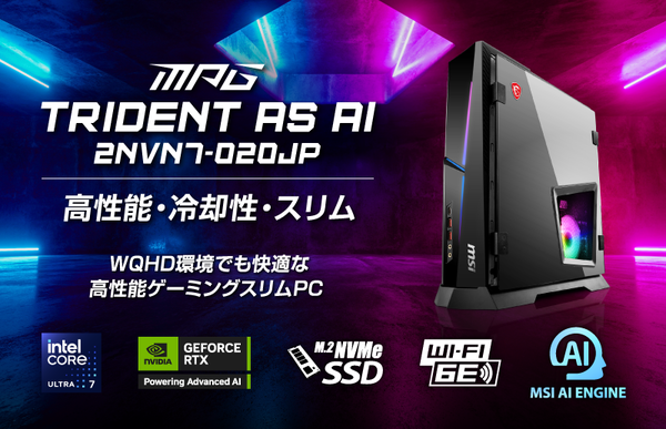 エムエスアイコンピュータージャパンは、8月28日より最新のゲーミングPC「MPG Trident AS AI 2NVP7-019JP」を含む3モデルを一斉に発売すると発表した。価格はMPG Trident AS AI 2NVP7-019JPが38万2800円前後、MPG Trident AS AI 2NVN7-020JPが34万9800円前後、MPG Trident AS AI 2NVL5-024JPが26万1800円前後の見込み。