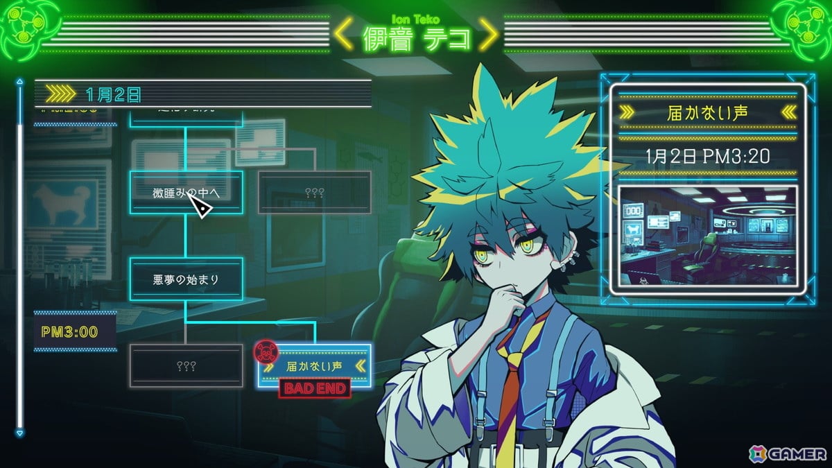 しかし本作はこの問題についてしっかり対策がされており、遊びやすいよう配慮がなされていると感じられた。推理アドベンチャーの法務省ルートは犬神軋に話しかけるとヒントを授けてくれるし、証拠にマークが付いているお助け要素もある。パズルに挑む保健省ルートはそもそもパズルの制限時間がけっこう長いし、もし解けなかったり選択肢を間違ったりしてゲームオーバーになっても、死んだ手前から即リプレイが可能になっている。科学省ルートのマルチ視点アドベンチャーはバッドエンド回避となる重要な分岐点をゲーム側が教えてくれるといった具合だ。