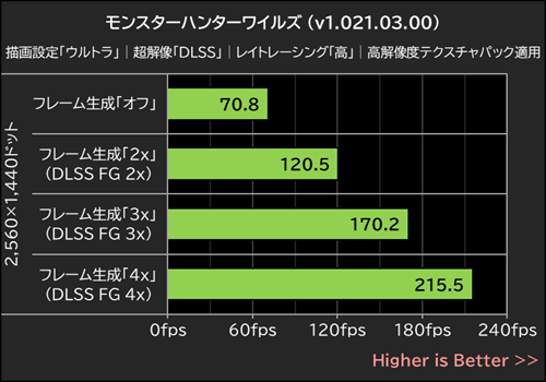 アップデートによりDLSS 4のマルチフレーム生成に対応したモンスターハンターワイルズでは、DLCの「高解像度テクスチャパック」を適用したうえで、グラフィックプリセットを「ウルトラ」に設定。WQHD/1440pでフレーム生成の設定を変更しながら平均フレームレートを計測した。