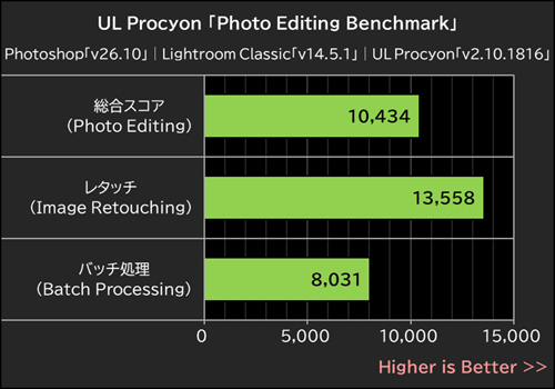 AdobeのPhotoshopとLightroom Classicを使用して、写真編集におけるパフォーマンスを計測するUL Procyonの「Photo Editing Benchmark」を実行した結果が上のグラフ。