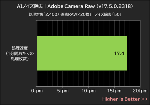一方、GPU性能がストレートに処理速度へ反映されるAIノイズ除去では、1分間に17.4枚のRAWファイル(2,400万画素)にノイズ除去を適用可能な処理速度を記録した。この処理速度は相当に高速なものであり、AdobeのAIノイズ除去を利用するユーザーにとっては極めて魅力的なパフォーマンスだ。