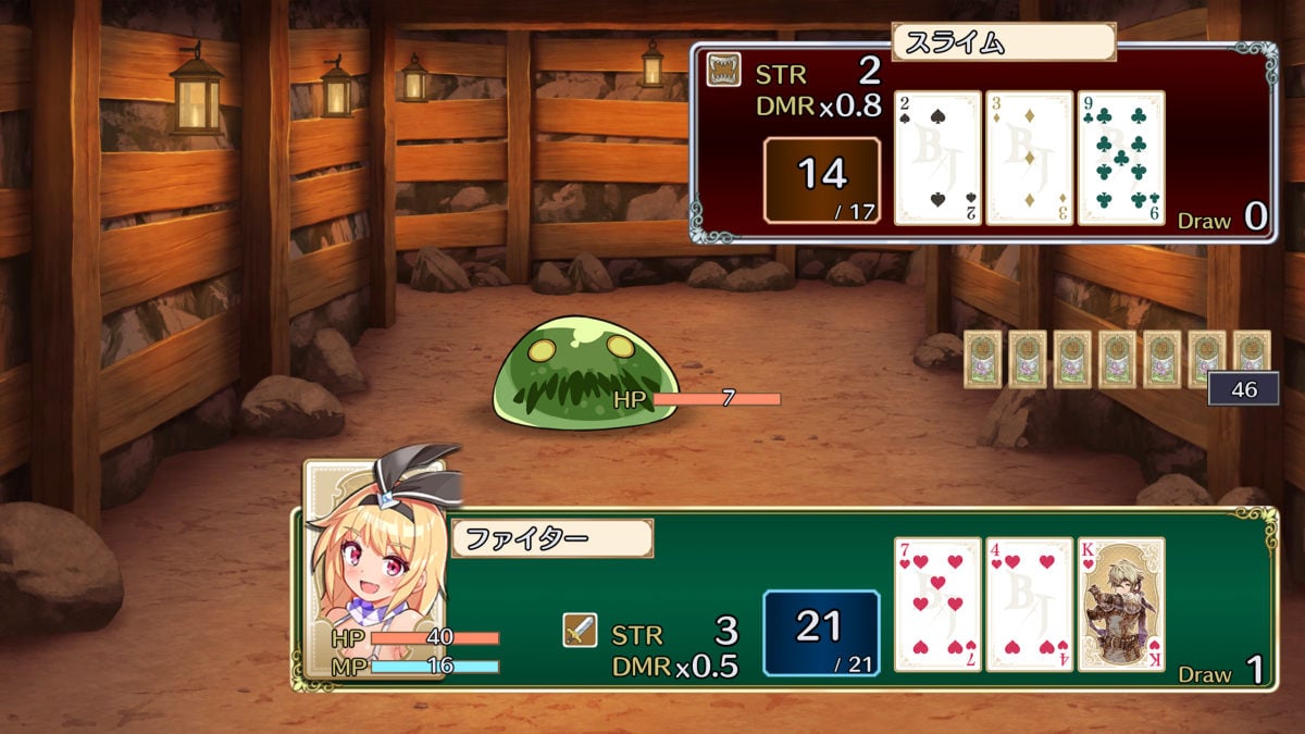 本作ではそんなモンスターとの戦いが、ブラックジャック風のシステムによって表現されている。カードゲーム「ブラックジャック」は、手札のカードの合計数によって勝敗を決するトランプを用いたゲームだ。手札のカードの合計数が対戦相手よりも大きければ勝利。ただし、合計数が22以上になった場合はバースト(バスト)となり、負けとなってしまう。