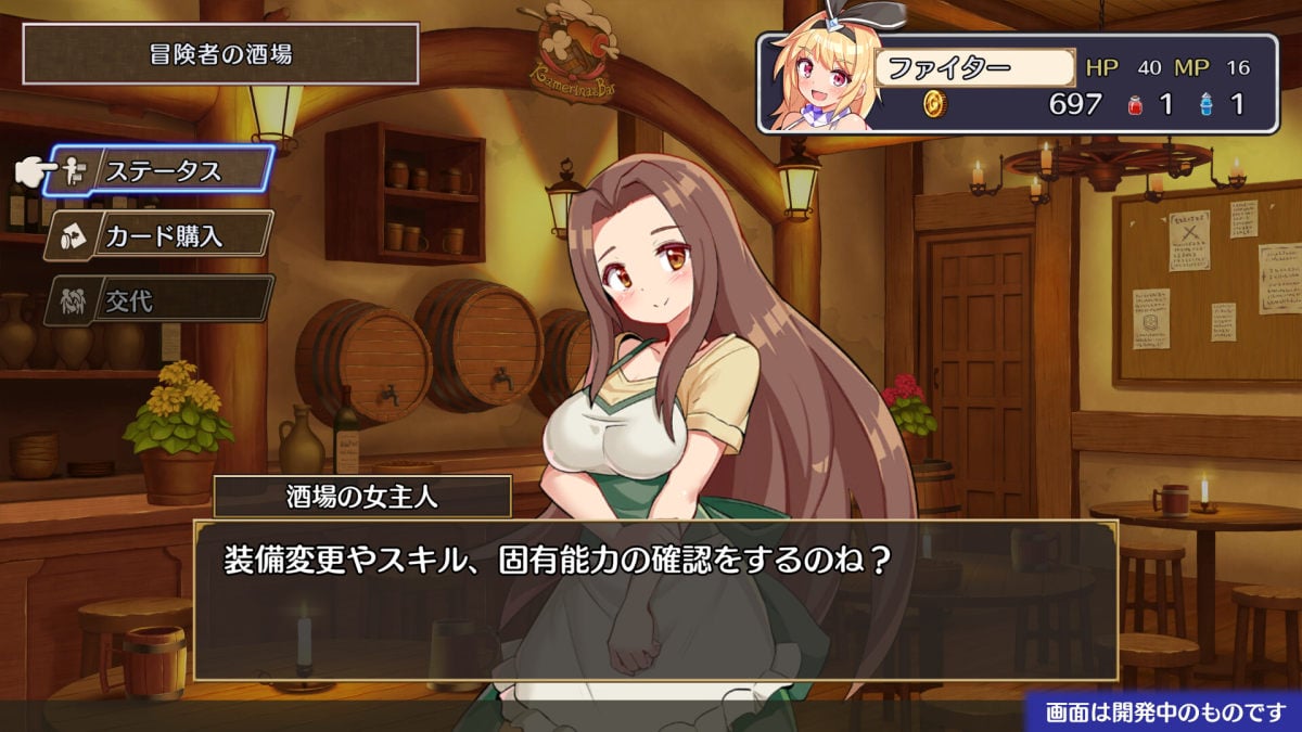 本作のブラックジャックには「リミット値」と呼ばれる合計値の限界となる数値が存在。プレイヤーは通常のブラックジャック同様21であるものの、スライムは17、オークは18など、それぞれにバーストとなる限界値が設定されている。ストアページによると、上限が21以上のトロールや、見せ札を隠すゴーストなど、特殊能力をもったモンスターも登場するそうだ。また要素としては、ストックしておいたカードと手札を交換できる仕組みや、特殊効果のあるスキルなども登場。装備品によって攻撃力の強化や、山札の数字を見るといった特殊能力も得られる。冒険を進めていく中では、成長カードによるステータス強化やスキル習得、ショップでのアイテム購入、合成による装備強化なども登場。本作ではRPGの仕組みで、ブラックジャック風のバトルを勝ち抜いていくのだ。
