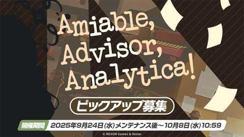 9月24日のメンテナンス後より10月8日10時59分にかけて開催される「Amiable,Advisor,Analytica!」にてピックアップ。なお、ピックアップ期間終了後も通常募集より入手可能なキャラクターとなる。
