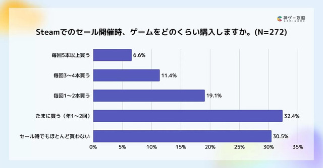「セール」の定義がSteamのシーズンセールだけなのか、パブリッシャー主催のセール等も含むのか、さらに言えばローンチ時の割引セールなども含むのか不明ですが、今回の調査によると「たまに買う(年1~2回)」が最多の32.4%、「セール時でもほとんど買わない」が30.5%となっています。