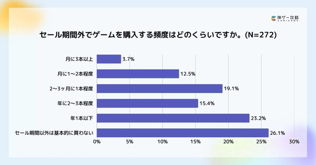 「セール期間外でどのくらいゲームを購入するか」の質問については、「セール期間以外は基本的に買わない」が26.1%と最多なものの、「月に1本以上買う」というヘビーユーザーも16.2%と結構存在します。