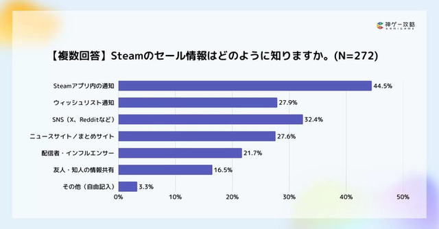 「Steamのセール情報をどうやって知るか(複数回答)」という質問については、「Steamアプリ内の通知」が最多、以下「X、RedditなどのSNS」「ウィッシュリスト通知」「ニュースサイト/まとめサイト」「配信者・インフルエンサー」「友人・知人からの情報共有」となっています。