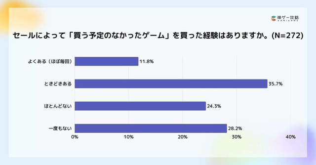 「セールによって買う予定のなかったゲームを買ったことがあるか」という質問には、「よくある」11.8%、「ときどきある」35.7%、「ほとんどない」24.3%、「一度もない」28.2%という結果になっています。