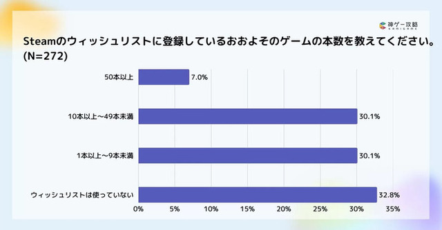 ゲームの配信開始・セール情報などを通知する「ウィッシュリスト」については「使用していない」と答えた人が32.8%にのぼり、使用率は約7割ほどとのこと。