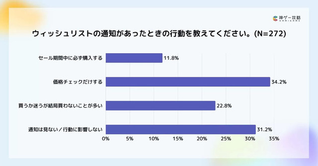「ウィッシュリストから通知があった際の行動」は「セール中に必ず購入する」が11.8%、「価格チェックだけする」が34.2%、「買わないことが多い」「通知を見ない・行動に影響しない」が計54.0%です。