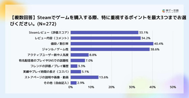 「Steamでゲームを購入する際に重要視するポイント」という質問の回答の上位は、「値段(割引率)」「ジャンル/ゲーム性」「レビュー内容(コメント)」「レビュー(評価スコア)」が上位を占めました。