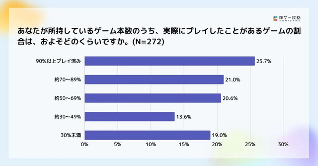 「所持しているゲームのうち、実際にプレイしたゲームの割合はどの程度ですか」という積みゲーの有無を問う質問には、「90%以上プレイ」というユーザーが25.7%と約1/4を占めます。