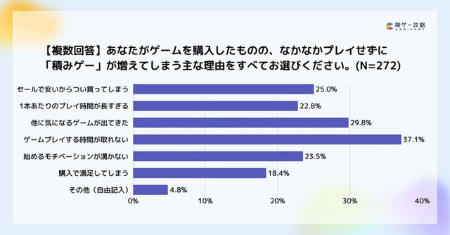 「積みゲーが増えてしまう要因」についても質問項目が挙げられています。最も回答が多かったのは「ゲームプレイの時間が取れない」というもの。次いで「他に気になるゲームが出てきた」「セールで安いからつい買ってしまう」「始めるモチベーションが湧かない」と続きます。