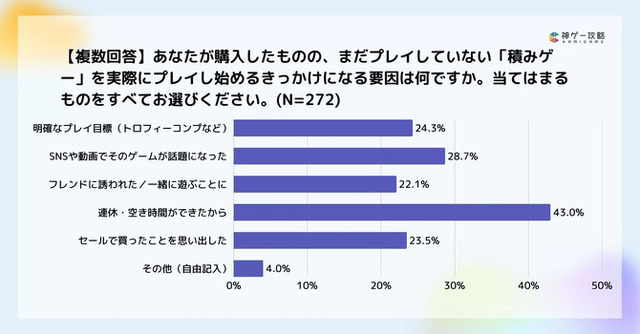 「積みゲー消化の要因」については、「連休・空き時間ができた」がトップで、以降「SNSや動画でそのゲームが話題になった」「明確なプレイ目標(実績コンプなどがある)」「セールで買ったことを思い出した」「フレンドに誘われた」と続いており、「積みゲーの消化」に意外とSNS・動画での流行りが貢献しているようです。