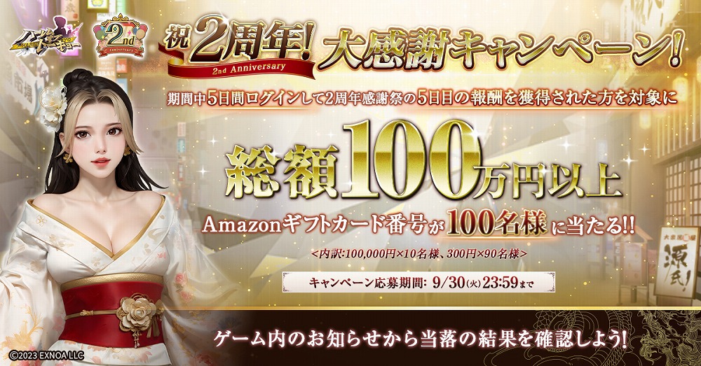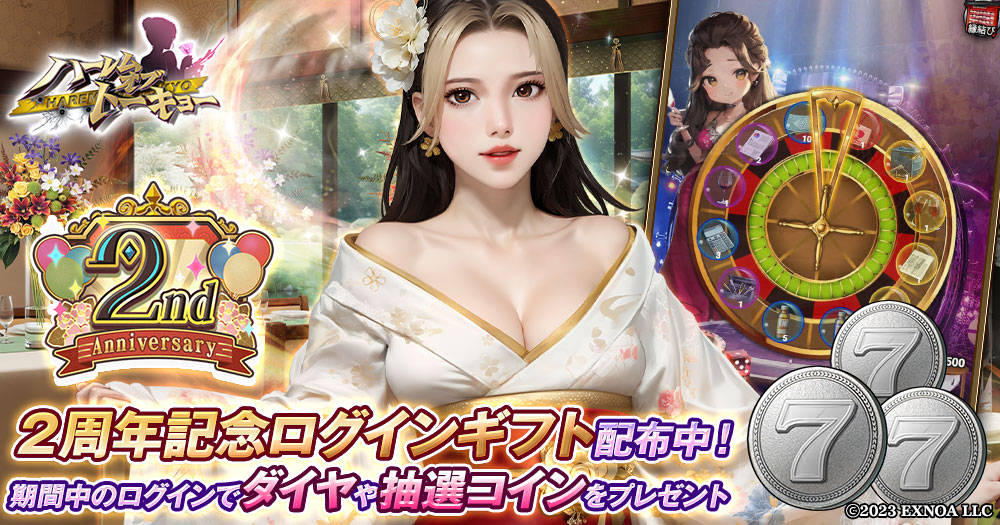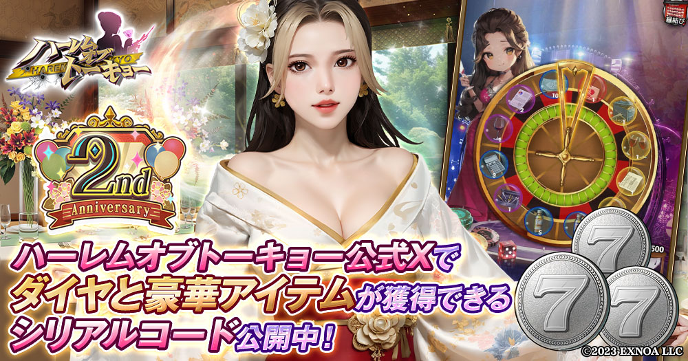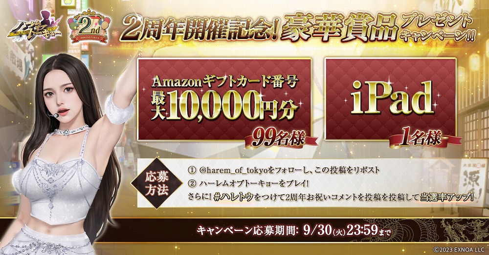 EXNOAは、アウトローハーレム系経営RPG『ハーレムオブトーキョー』にて、2025年9月20日(土)より2周年記念イベントを実施している事を発表した。