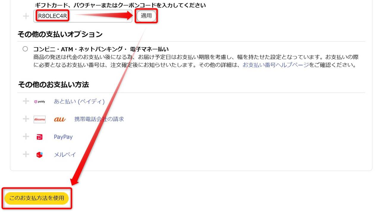 ▼製品をカートに入れてレジへ進み「ギフトカード、商品券、プロモーションコードを使用する」をクリック。以下の通り割引コードを適用しましょう。↓