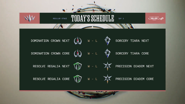 Day 3では、1試合目に「Domination Crown(DC)」と「Sorcery Tiara(ST)」が対戦。この試合では代打制が行使され、ST NEXTのSUP本田翼さんの代わりに一ノ瀬うるはさんが参戦。試合は2-0でDCが勝利し、3ポイント獲得しました。2試合目には「Resolve Regalia(RR)」と「Precision Diadem(PD)」が激突しました。こちらの試合は、RRが2連勝し3ポイント獲得。この日、ポイントを獲得したDCは首位キープ、RRは2位に浮上しました。