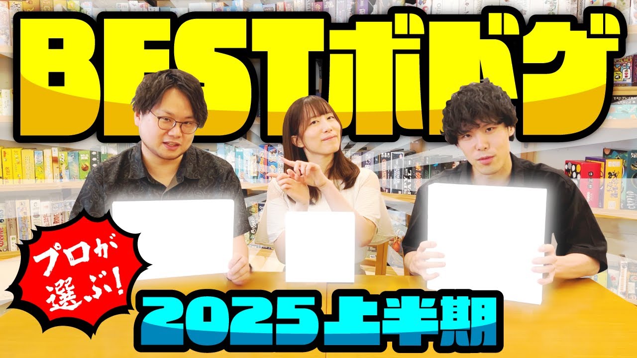 ボドゲ毛のプロが本気で選ぶ 2025 上半期ベストボードゲームランキング。イエ。 [音楽] GJカフェ大宮店長のさ彦子です。 GJカフェ池袋2 号店長の仙裸です。商品開発部の飯田です。 今回は忖度抜き現役業界時の私たちが上半期に発表されたボードゲームの中からランキングですね、 3 位から発表していきたいと思います。早速発表していくんですが、え、この前ですね、 SDJ ドイツ年間ゲーム対象を取ったあの話題の作品、ボムバスターズは今回は電動入りとしてランキングから、え、抜かせていただいております。 それでは早速第 3位の発表です。せーの お え [拍手] え、すごい気になりますけど。はい。 これ新しいすよね。めちゃめちゃ最近だと思います。 はい。そうですよ。もうピカピカのこちら持ってきました。私の個人的に選ばせていただいた 3位はニムと弾爵です。 皆さん、ニムトっていうゲームはご存知でしょうか?実はドイツのカードゲームの王様とも言われるとっても大人気のゲームがあるんですが、それがなんと最新作が 2025年に出ちゃいました。 うん。 何が違うのかと言うと、今までは手札大量の中から選んでたんですけど、 4 枚っていう限られた選択肢の中からカードを出していくことになります。 そして今までは 6 枚目をカード出しちゃったら牛さんたちマイナス点引き取らなきゃいけないよっていうルールだったのが今回はま、もちろん 6 枚目もダメですよ。ただ牛さんの色同じ色が 6 匹目が溜まっちゃっても引き取らなきゃいけないんですね。 [音楽] なのでより失敗しやすくなっちゃってるのでマイナス点取っちゃうかもよなキドキ感が前作のニムとよりももう高まっちゃってるんですよ。 うん。 なのでこれはニムとやったことある人にもニムとやったことない人にももう最初から結構お勧めしちゃってます。あとは自分の手になった時に今まではほぼほぼオートで配置してたんですけどニムと暖職では自分の手番で選択肢があるんですよ。どっちに置こうかなっていう風に選べちゃうので、 [音楽] より自分で操作している感覚があります。 現よりでも運の要素も結構強いからその色が消えちゃったりするんですよ。 持ってた色がなくなっちゃったりするから俺受けなくなっちゃったみたいな感じがめっちゃおもろい。 じゃあ僕から説明させていただきます。チャージというゲームですね。皆さんご存知でしたか? チャージ知らないです。 チャージ協力して皆さんで手札とデッキのカード全部使い切りましょうっていう使い切ったら皆さんの勝ちですというゲームなります。で、誰かがこう出せなくなってしまったり何もできなくなってしまうとその時点でゲームオーバー敗北ですっていうゲームになってます。 すごい面白いとなんですけれ、ま、アクションはコストがかかりますよ。で、カード出すなら順でしか出せないので 9が出たら9か8しか出せませんよ。 で、これ0 になっちゃうともう後がないですよみたいな感じになるんですけど、なんか協力ゲームって作業感出ちゃう時って結構あると思ってるんですけど、それが [音楽] 協力ゲームのあんまり面白くない時があるんですけど、このゲームは何でしょうね。 いつ遊んでも次のターンに地獄が待ってたり、その次のターンでこう一発逆転があったり展開がなかなか読めないけど少ない手札の中で最大限こう頭をこねくり回して考えるのがすごい楽しい。 [音楽] うん。 で、数字0から9とAからK とかのアルファベットを使ってるんですけど、で、これやっぱりカードの構成が佐藤さんの技というか、そう、尊敬しています。それを感じたのがチャージ。うん。 そうですね。はい。 これぜひやってみてほしい。 え、気になりますよ。 で、ま、で見つけて開発部で遊んでもうみんなで大絶者みたいなこ ね。小箱ちっちゃい箱のねカードゲームかな。これも続きましたけれども そ置がお持ちのそれは何だ? ペラペラペラ。 すいません。僕がさに選んだのはへゲモニすぎてちょっとお店には置いてない [音楽] ゲームになります。どういうゲームかって いうと政府が大きくそこに働く人と会社 作る人みたいな感じでいろんな役割がある のを皆さんそれぞれのプレイヤーがになっ てでそん中で1番ま、うまくいった人が 勝ちみたいなゲームになってます。で、 このゲーム大将に皆さんなっててそれぞれ の目的が違うようになってます。さっき 言ったように、え、政府は、えっと、 それぞれのプレイヤーが全員が幸せになる ことを考えて動かなきゃいけないと。あと は、えっと、会社を作る人はちゃんとそこ で経営してお金を稼ぐ。 で、働いてる人は自分で働いてそのご飯とかちゃんと毎日食べれるようにうまくやるみたいな、全プレイヤーが違う目的を持ってるバランスどうなってんのみたいな感じなのにちゃんと全員ヒリヒリしてて楽しいっていう最高の思いになってますね。 [音楽] 大さんが慎重です。そうですね。 そう。ちょっとね、あの壁長