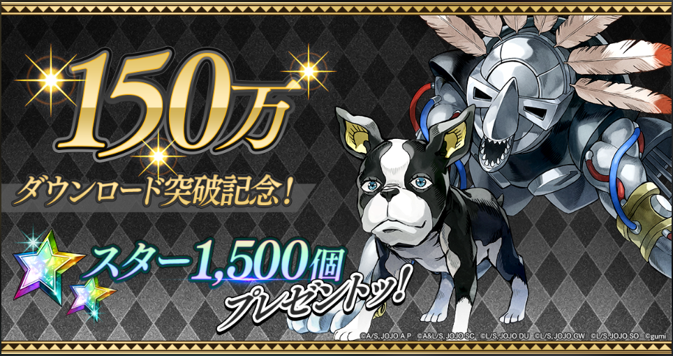 150万ダウンロード突破を記念して、期間中にログインした方全員にスター1,500個(ガチャ10連分)をプレゼントいたします。ぜひログインしてお受け取りください。