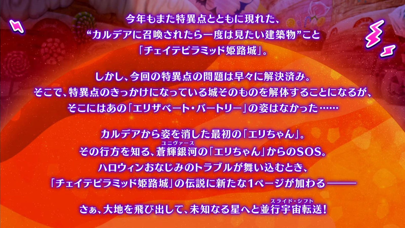 今年のハロウィンイベント「ファイナル・ハロウィン2025 ~パンプキンプラネットに輝く歌姫~」では、カルデアに召喚されたら一度は見たい建築物こと「チェイテピラミッド姫路城」が、特異点とともに再び出現する。特異点の問題は早々に解決。カルデアは、特異点のきっかけになっている城そのものを解体しようとする。しかしチェイテピラミッド姫路城は主人公を乗せたまま宇宙船となり、年中ハロウィンの星パンプキンプラネットへと飛んでいってしまう。今年もハロウィンおなじみのトラブルによって、チェイテピラミッド姫路城に新たな歴史が刻まれるようだ。