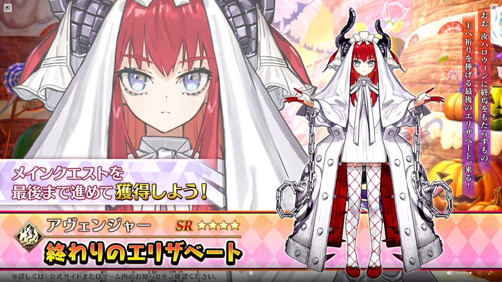 イベントの配布サーヴァントとしては、星4アヴェンジャーの「終わりのエリザベート」が登場となる。あわせて、星4ランサーの通常エリザベート、星4キャスターのエリザベート[ハロウィン]、星4アルターエゴのメカエリチャンおよびメカエリチャンII号機に強化クエストが追加。星5ランサーのエリザベート・バートリーも登場となる。ハロウィンイベントにあわせて、エリザベート尽くしとなっている。