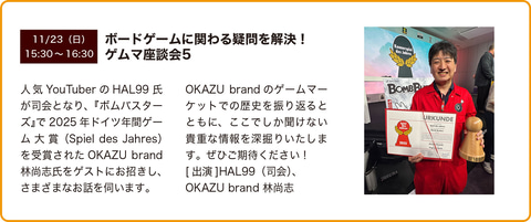 また今回、スペシャルステージには、ボードゲームの最も権威ある賞である2025年ドイツ年間ゲーム大賞(Spiel des Jahres)を受賞した、OKAZU brandの林尚志氏が登壇。日本のクリエイターによるこの快挙を、会場の皆様と一緒にお祝いするほか、さらに、OKAZU brandのゲームマーケットでの軌跡を振り返るとともに、世界に認められた作品の背景や、ここでしか聞けない貴重な情報を深掘りする。