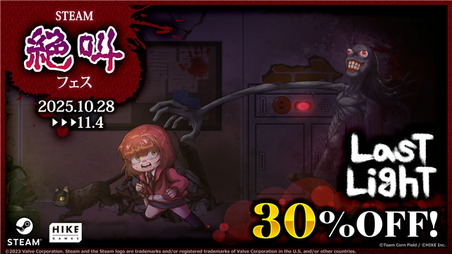 HIKEのゲームブランド「HIKE GAMES」は、Steamの「Steam絶叫フェス」に参加し、現在発売中の『Last Light』を30%オフで購入できることを発表した。