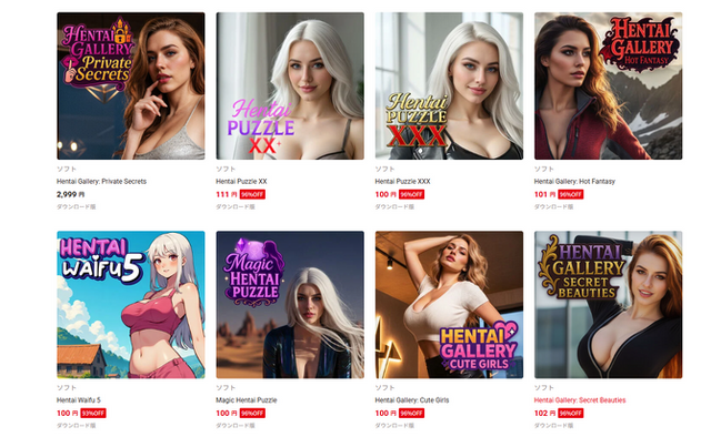 それらタイトルの多くは、90パーセント以上の大幅なセールが実施されており、100円程度で購入可能です。大幅な値引きによって購買者の関心を引くような販売形態が目立っています。