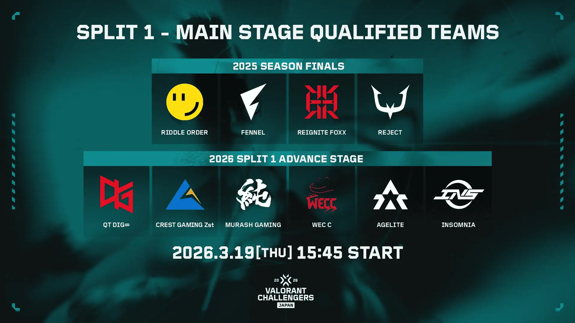 Main Stageには2025年のシーズンファイナルに出場したRIDDLE ORDER / FENNEL / REIGNITE FOXX(※NOEZ FOXXとREIGNITEが業務提携)/ REJECTがシードとなり、そこにAdvance Stageを勝ち上がった6チームが加わってSplit 2 Main Stageへの出場権をかけて戦います。
