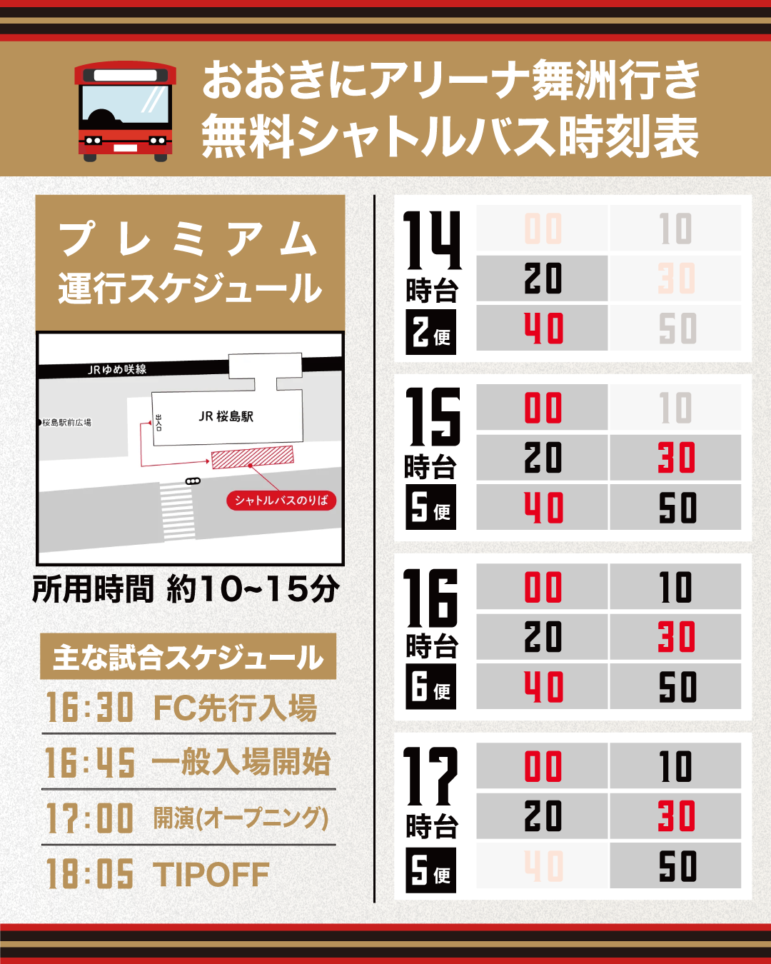 なお、大阪ブルテオン試合時はシャトルバスの運用が異なりますのでご注意ください。