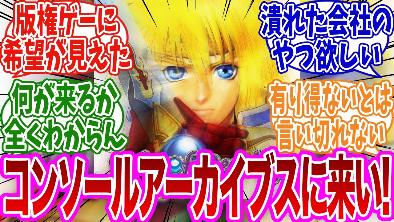 「コンソールアーカイブスで出してほしいゲームを挙げてけ」に対するみんなの反応集 #反応集 #ゲーム ◆引用元スレ◆ https://bbs.animanch.com/board/6277109/ 使用音声 VOICEVOX:ずんだもん ※動画内の素材はすべて引用であり、著作権や肖像権を侵害する目的はございません。 #GAMING5chGamegame newsgamesgaming newsゲーミングゲームゲーム攻略ゲーム最新情報反応集 29 Comments @Toraku_Guest_VTuber 2週間 ago リモートコントロールダンディきてくれソフト持ってるけどさすがに現行機でやりたい @千百秋-p9e 2週間 ago トゥルーラブストーリー出して欲しい @にへい-o2k 2週間 ago PS1行けるならジョジョ未来への遺産とTOEとデジワー辺りが来ると嬉しい @シルタリス 2週間 ago PSでいいならアストロノーカやりたいなあとSFCなら天地創造とか新桃太郎伝説といったリメイクが絶望って言われてるソフト @samlie93 2週間 ago 大昔のPCゲームはEggコンソールがカバーしてるし、本当に隙無いな @wingfufuneko8550 2週間 ago 版権の問題で無理だとわかってるけどスウィートホーム後のバイオハザードの原点 @白カラス-w1h 2週間 ago レガイア伝説だな @sunrising4001 2週間 ago セガラリーシリーズやパンツァードラグーンシリーズはSEGAからの復刻して欲しいしなぁ。パラッパラッパーでも挙げときますか。 @akatsuki517 2週間 ago PS1のデジモンワールドが本当にほしい今までこういったアーカイブ系に来たこと無いから、権利問題が厳しいのかな… @ヨッチャン-b2c 2週間 ago 作品によって値段が違うことをゲームアーカイブスより値段高めなんだよね @プラム桃鉄ch 2週間 ago PCEのドラえもんは胎教だったから待ってる @ヒラ-f4v 2週間 ago クールボーダーズが配信されたってことはライジングザンも期待できるのかな @user-pecoque 2週間 ago いわゆるクインテット三部作やワンダープロジェクトJ1、2といった開発会社がなくなった系のヤツをなんとか出して欲しい @zzysk2 2週間 ago レトロゲームに胸ときめかせるような奴相手にするなら旧世代切りは間違いな気もするが、いかがなものか? @zzysk2 2週間 ago ハムスター側はサブスクとの被り気にしないで出すと言ってるしこの間のアーカイバーでコエテクの人から説明書の取り込みとかせーや!言われてたからそこで差別化していくんだろうね @ヨシタカ-m4r 2週間 ago ゲームの版権って映画の版権みたいに何十年か経てば消えるのかな? @日向時間 2週間 ago パイオニアLDCのごきんじょ冒険隊にバウンティソード来てくれ @oldstyle4428 2週間 ago ドラえもんの一点で一気に先行きが分からなくなったのが面白い @こむらがえり統一チャンピオン 2週間 ago 権利的には今どうなってるのか分からないまま学生の作ったクローンゲームがフリー配布されてる"ダンジョンマスター"のSFC版… @上杉アイク 2週間 ago ゼノギアスは来て欲しいのうできればゼノサーガもゼノブレイドでゼノシリーズの需要高まってるのよ @ニート-o6e 2週間 ago 動画に上がってないやつならアイドル八犬伝を何卒 @レンスラ 2週間 ago コミケやApp Storeで展開していたレトロゲームパブリッシングがここまで大きくなるとは思わなかったよ…コエテクはやっぱり(よるのないくに辺りの)明確な失敗作以外作品展開したい意向か @レンスラ 2週間 ago 2:59 lainは新規ファンのうるさいくらい熱烈なアピールでかつての製作陣も秒読み感覚でリメイクせざるを得ないだろう @レンスラ 2週間 ago ラブデリック製作陣が作ったコンタクトはくるか?いやDSだから難しい上に、仮に外付けで2画面環境になってもまだ先になるか? @アキ-q8v 2週間 ago ブラックマトリクスシリーズ…同じ会社のサモンナイトは復活したけど @地味-t8m 2週間 ago パワポケとわくわくぷよぷよダンジョン @T1030-x1e 2週間 ago 潰れてない会社でねえ…メメタルマックス2リローデッドってのがあってねえ…ね?潰れてないのに出る気しないでしょ? @なっきゆ 2週間 ago マジカルチェイス来ないかな〰️ @a.k.a3759 2週間 ago 黄武で出撃したい Write A Commentコメントを投稿するにはログインしてください。