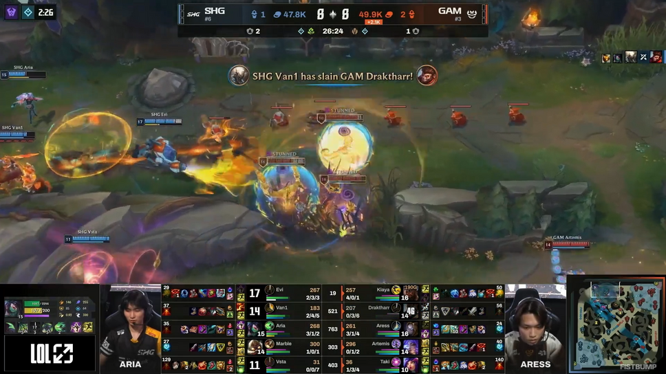 続くGame2ではヴァイ&アーリのコンボを狙うSHGに対してGAMはMIDメルでカウンター。さらにGAMはBOTデュオがタワーダイブを捌いて2キルを獲得するなど、18分段階で約4,700ゴールドの大きな優位を築き上げます。厳しいかに思われた試合でしたが、SHGは巧みな連携で遭遇戦での勝利を積み重ねていくと、30分過ぎに遂に逆転に成功。チーム全体で最後までディーラーのMarble選手を守り切り、立て続けの逆転勝利で2-0とします。