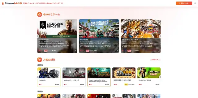 Steamトレンドは、PCゲームプラットフォーム「Steam」で今流行しているタイトルをランキング形式で確認できる無料のキュレーションサイトです。独自分析による国内トレンドランキングや5段階評価、発売カレンダーなど全19カテゴリを備え、ユーザーのゲーム選びを支援しています。