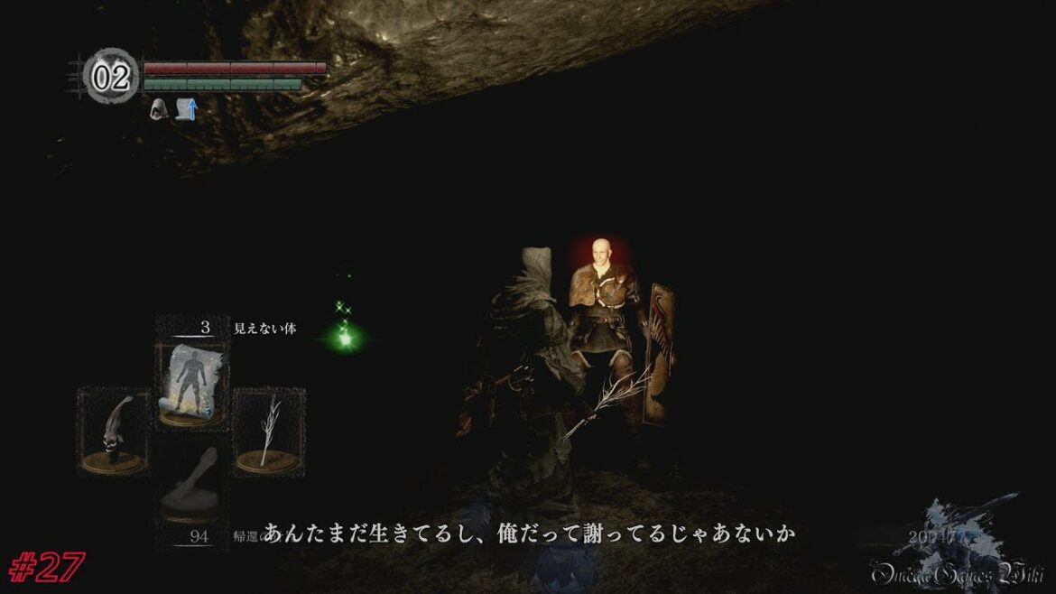 ・「非聖職者ルート」 – 崖から落とされた後にパッチに話しかけ、会話に「NO」を選ぶと「人間性の双子」をもらえる。その後、墓王ニト撃破後に火継ぎの祭祀場に移動、アイテムの販売の他、ジェスチャー「土下座」も学べる。