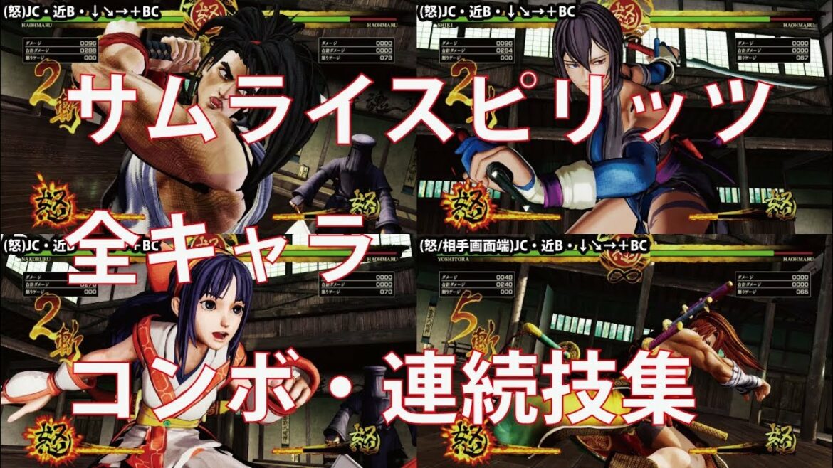 全キャラのコンボ・連続技集です。通常技のみ、必殺技使用、武器飛ばし使用と3つに分類しています。J=ジャンプ中 A=弱斬り B=中斬り C=強斬り D=蹴りでコマンドは右向き時。