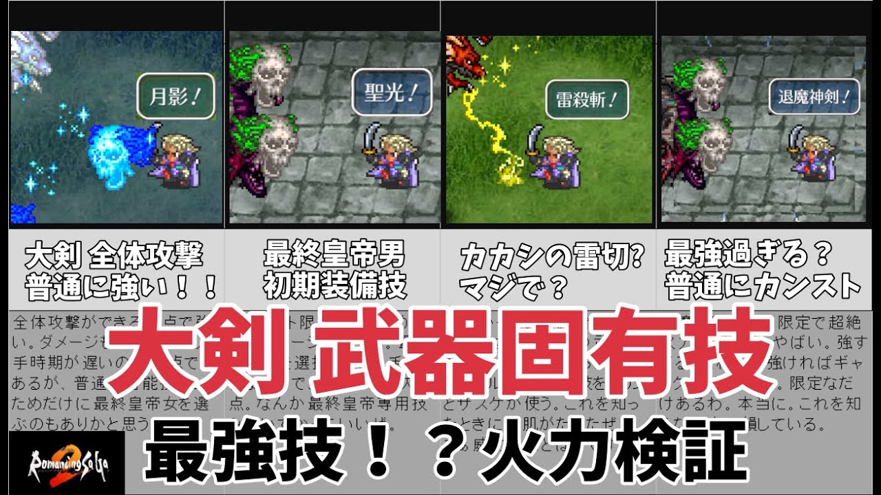 武器固有技シリーズ 大剣編 楽しみながら作れました。良ければご視聴おねがいします。 こんなに強い技とは知らなった。 あんまり武器固有技を閃いていない人はぜひ見てください。 新しい発見があるかも! ※1 2400クラスのダメージも計測 ※2 不死族系 獄龍にて(剣技Lv50、棍棒Lv43) ※3 虫系カイザーアントにて 通常の1.37倍 ※4 人系 確率で即死効果 ※5 不死族系 獄龍にて(剣技Lv50、冥術Lv33) iOSRPGおすすめスマホプレイ動画ゆっくりゆっくり実況リマスターリマスター版ロマサガ2ロマンシング サ・ガ2ロマンシングサガ2七英雄固有技大剣攻略最強最終皇帝武器固有技術 WACOCA: People, Life, Style.