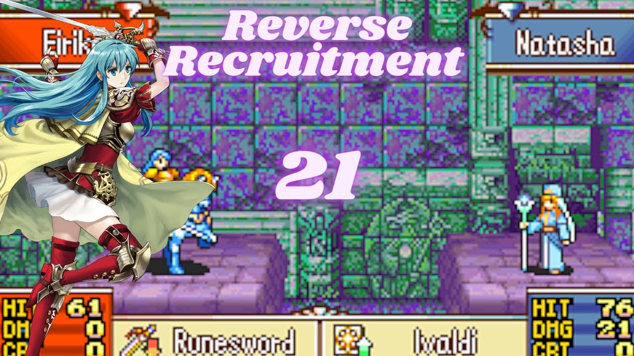 Welcome to Sacred Stones Reverse Recruitment. Every playable character, including those found only in creature campaign, is recruitable. Hack was found here along with charts to display recruitment order. https://forums.serenesforest.net/index.php?/topic/63349-katies-fe8-creature-campaign-reverse-recruitment-version-40-now-out/ There are 2 different versions depending on the route split. I will be doing Eirika’s recruitment order but choosing Ephraim mode for the playthrough.