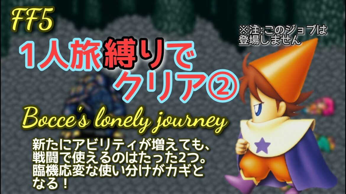 前回コメントできなかった分も含めて。名前の「ぼっち」がバッツに近い語呂でツボです(笑)内容としては職業縛りで初めて知った内容が惜しげなく詰め込まれてました!すっぴんの2アビリティ+能力引き継ぎが思った以上に利いてますね(^^)サムネの注釈(笑)