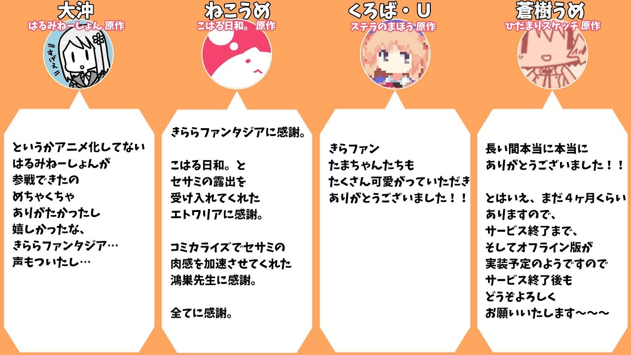 2023年2月28日をもってサービス終了すると発表した『きららファンタジア』。発表を受けて、担当声優・原作者のみなさんがTwitterでコメントしていたので、まとめました