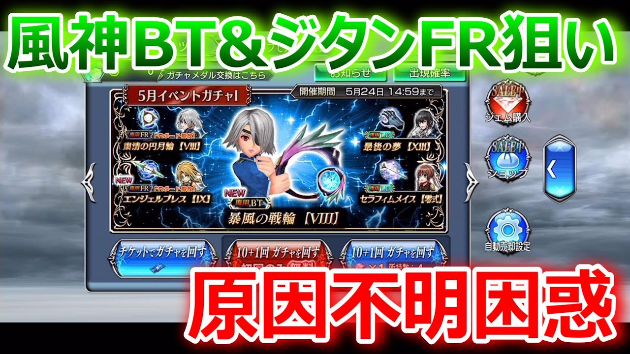 自分は無料チケットで未所持の風神のFR、ジェムでジタンのFRを狙っていたら風神BT出て、狙いのジタンFRは天井でしたw