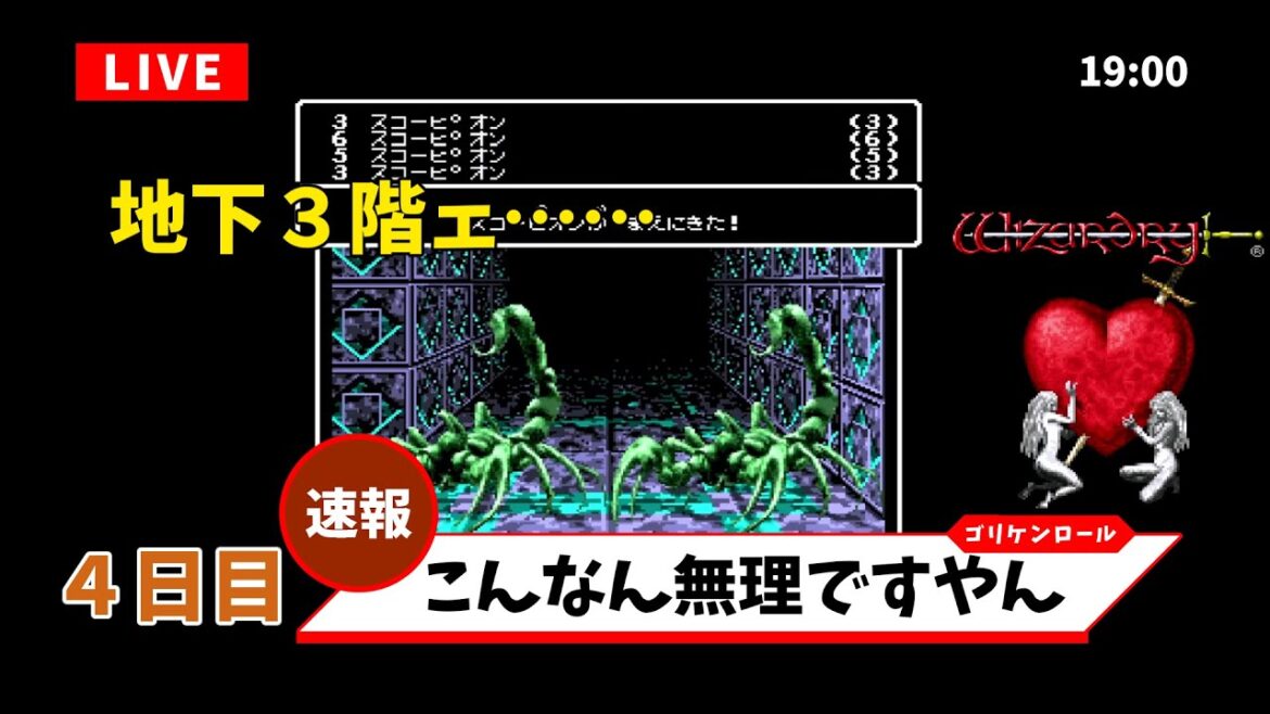 前回地下3階で大量のサソリ座のオンナにフルボッコにされた我がパーティー。宿題としてレベル上げするとか言っておきながら何もしてないので、今回もそこはかとなく漂う停滞感。一体どーなってしまうのか?