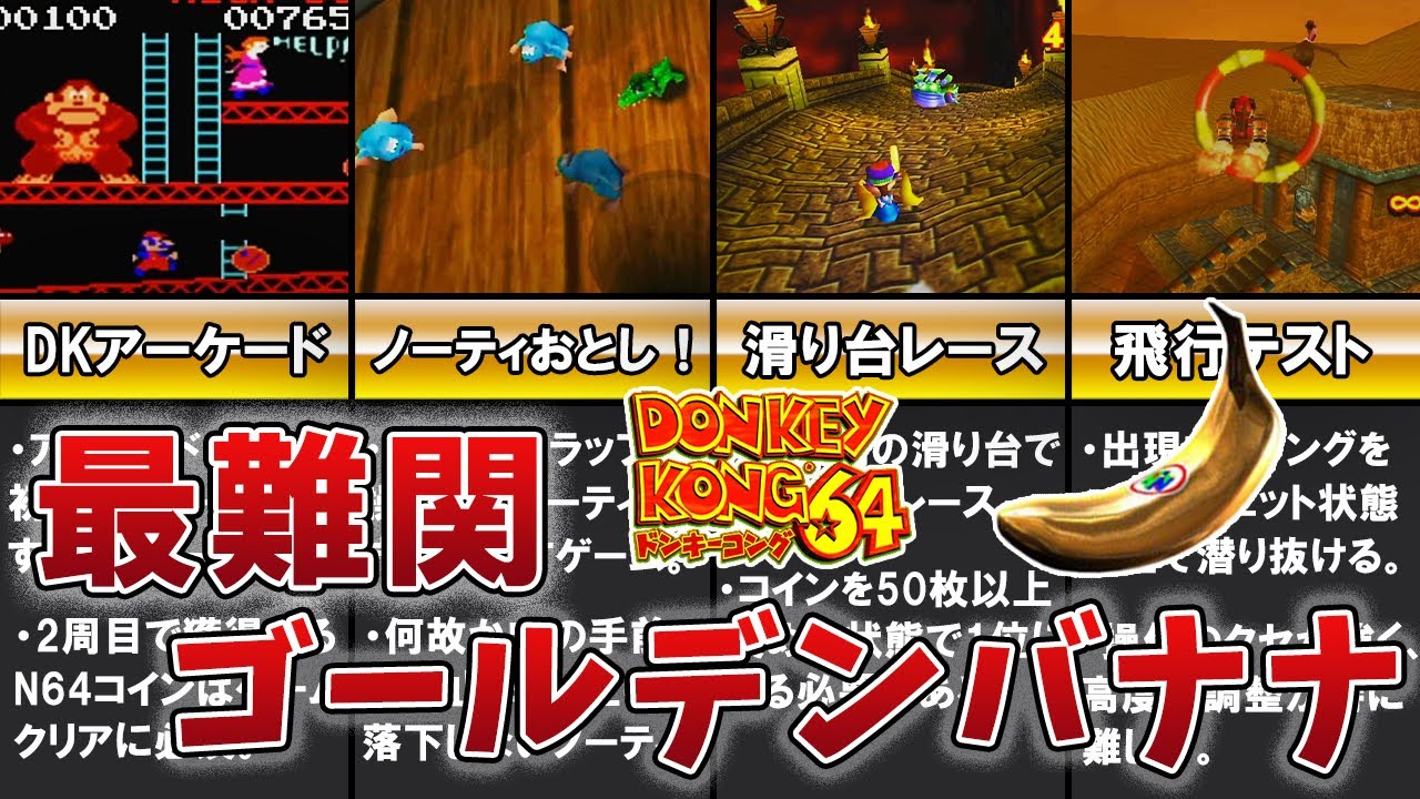 ドンキーコング64に登場するゴールデンバナナを手に入れるのが難しい順にランキング形式で解説しました!