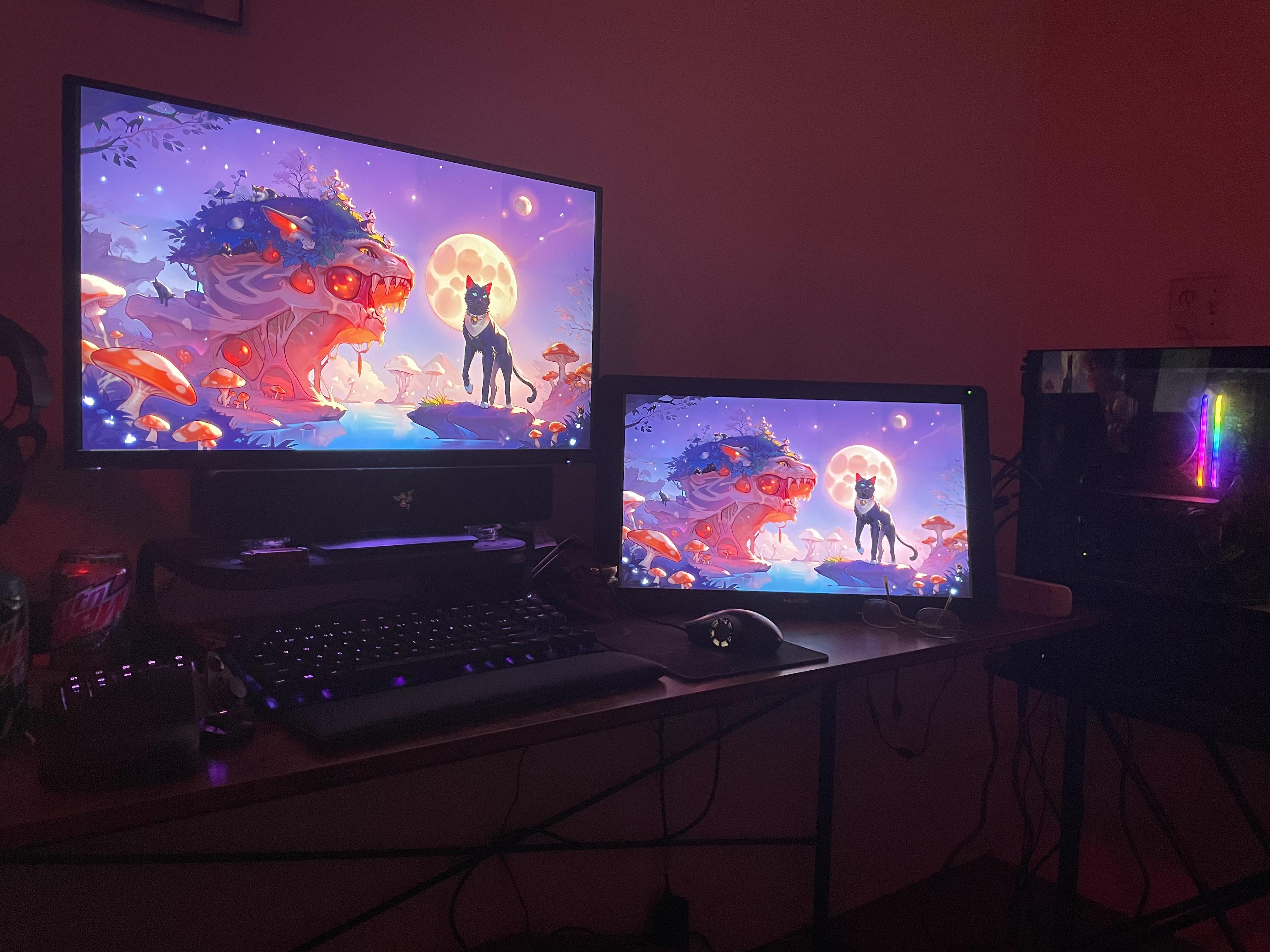 マウスパッドがあれば、すべてが揃うと思います。ディスプレイポートケーブルがあれば、メインモニターにアダプターを使用する必要がありません。右の2台目のモニターはHuion Kamvas 22インチプラス描画モニターで、3 in 1ケーブルはHDMIのみです。そのため、現在はメインモニターにアダプターを使用しており、描画モニターはHDMIポートに直接接続しています。