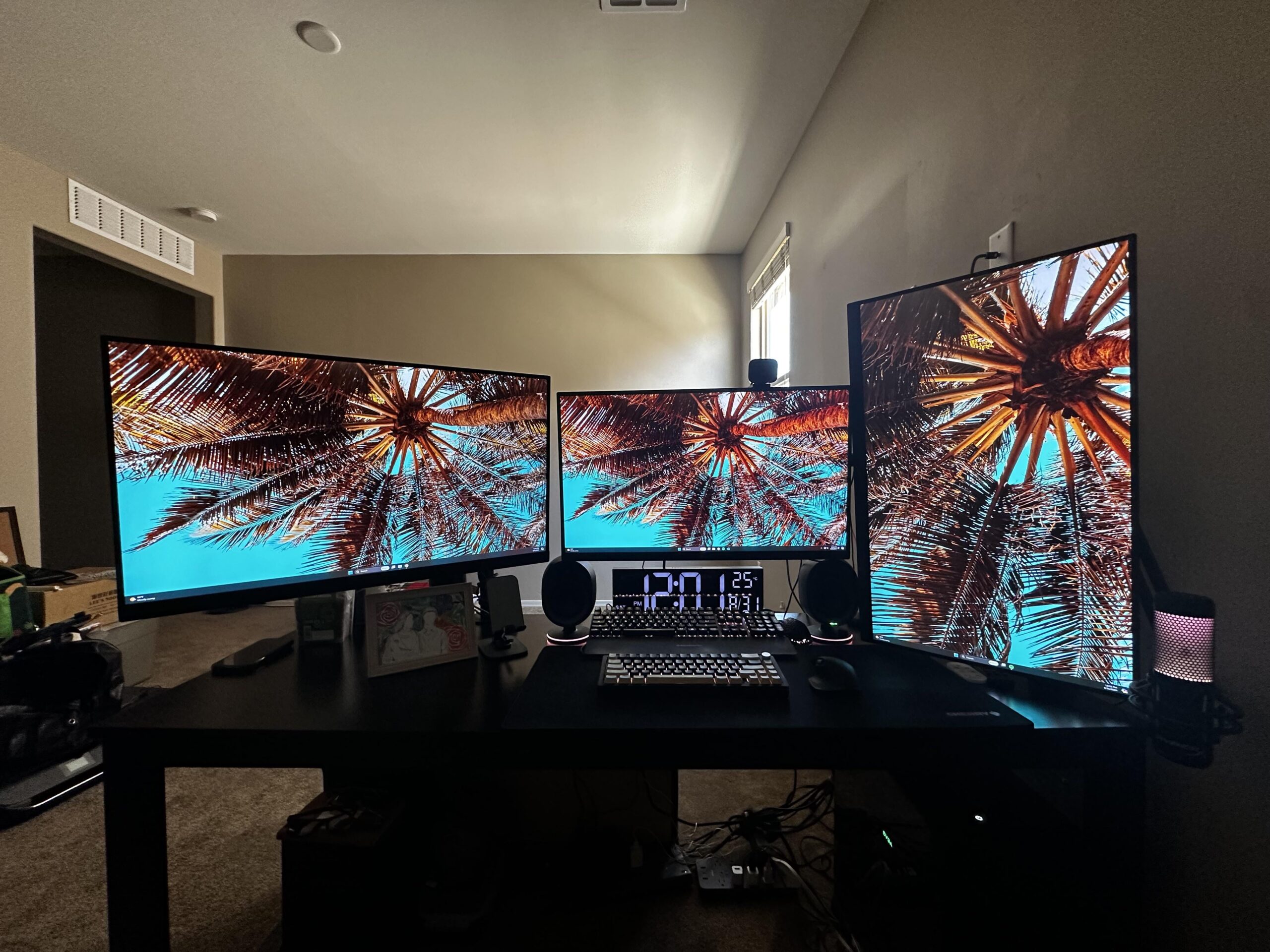 LG モニター 3 台、32 インチ 2K パネル 2 台、中央に 27 インチ パネル 1 台。
