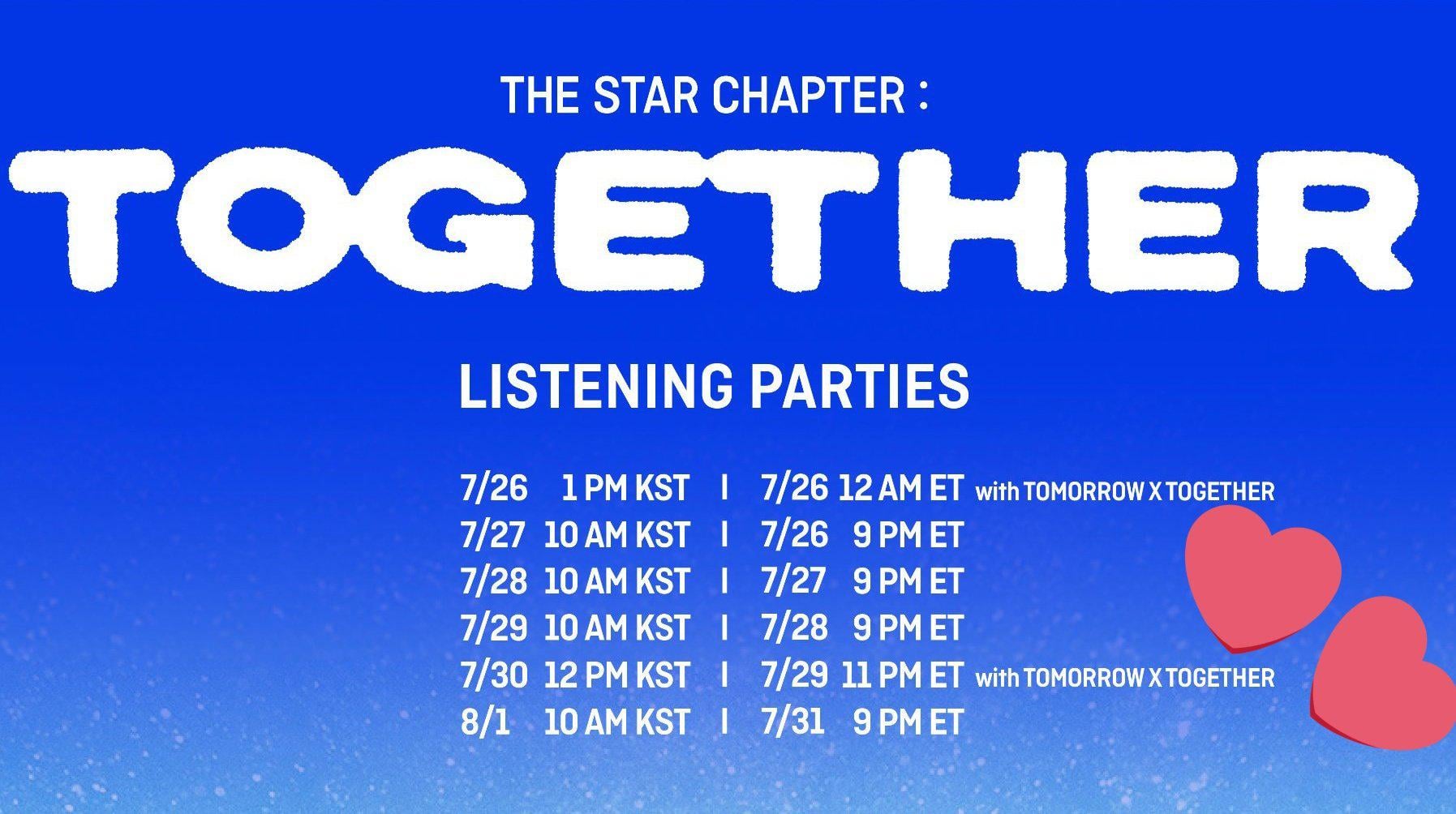 TXT 2025-07-30 「The Star Chapter:Together」のリスニングパーティーは、今回のStationHeadでまもなく始まり、TXTが存在します!! こんにちはモアス!!のためのリスニングパーティー "星の章:一緒に" 今回は非常に特別なゲストと一緒にステーションヘッドでまもなく始まります!!。 あなたが興味があるなら、私たちに参加してください!!必要なのは、いつものようにSpotify PremiumまたはAppleアカウントです(Apple Premium PLZがSpotifyの代わりに使用している場合は、BB200で大いに役立つでしょう!!) リンク:share.stationhead.com/s11ktg7f7589 TOMORROW X TOGETHERTomorrowByTogethertxt Write A Commentコメントを投稿するにはログインしてください。