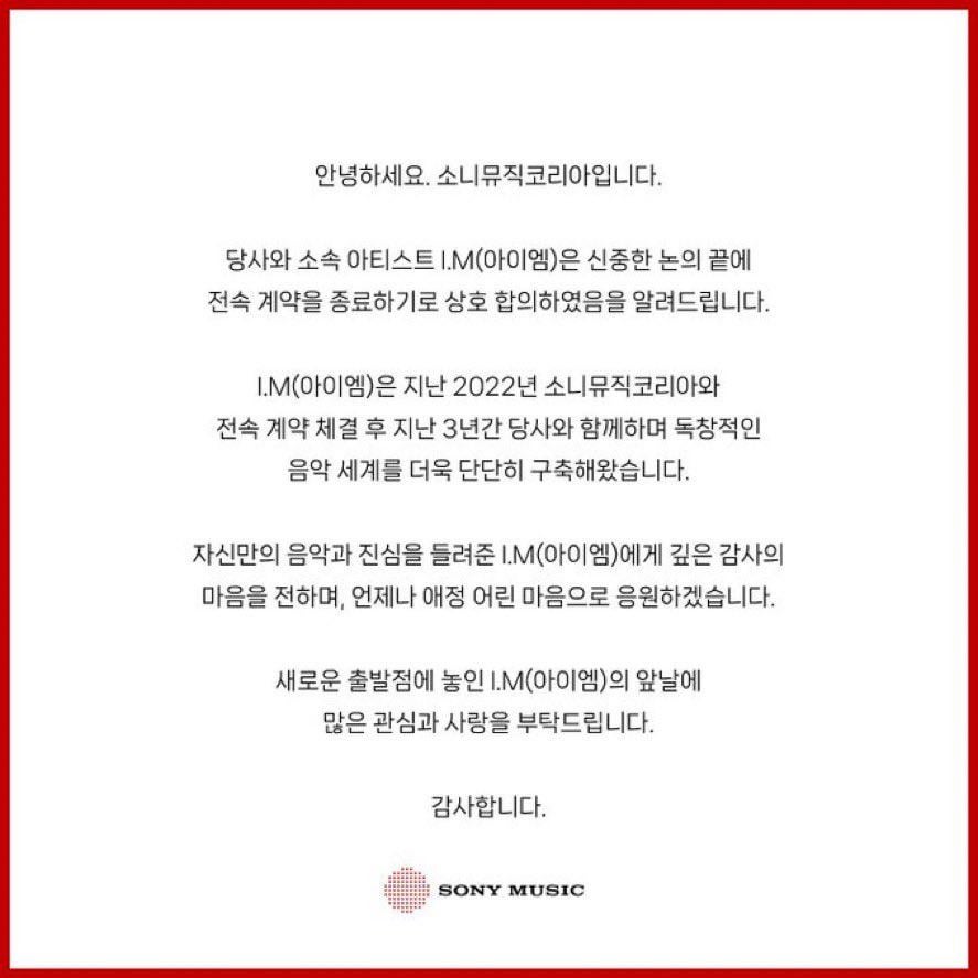 K-POP News 2025-09-15 Monsta X IMは、相互合意を通じて、ソニーミュージックコリアとの排他的なアーティスト契約を終了しました Monsta X IMは、相互合意を通じて、ソニーミュージックコリアとの排他的なアーティスト契約を終了しました K-POPK-POP NewsKPOPKPOP NewsNEWS Write A Commentコメントを投稿するにはログインしてください。